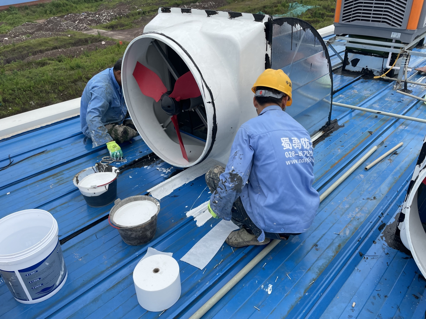 屋頂的排風管周邊采用SYR金屬屋面專用防水涂料處理