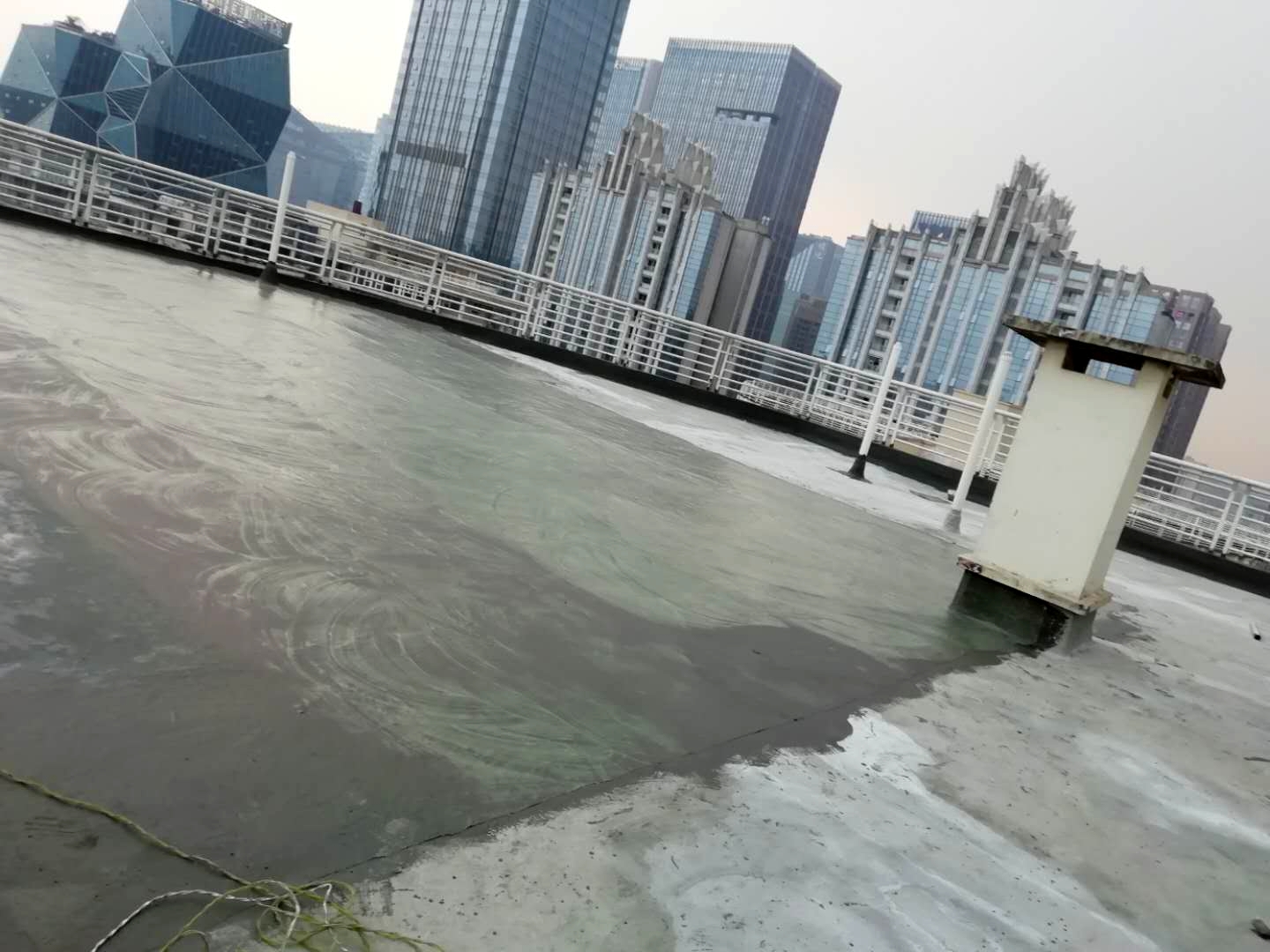 成都市天府大道天鵝湖花園2棟與10棟屋頂存在漏水的現象,經過我公司技術人員到達現場查勘情況,為屋頂原防水層有破損漏水問題,并且屋頂的原保護層也有很多翻砂起殼根據現場實際情況,我公司根據現場實際情況制定的方案為,將屋頂表面已破損的砂漿保護層進行修補處理,先采用聚合物水泥防水涂料配合防水專用縫織聚酯布對基層表面裂縫進行加強處理,然后整個屋面采用蜀禹公司的國標I型聚合物水泥防水涂料配合防水專用縫織聚酯布一布三涂方式進行防水施工,待干后表面再涂刷SYR金屬屋面專用防水涂料,最后表面再涂刷蜀禹透明高分子防水液罩面層。