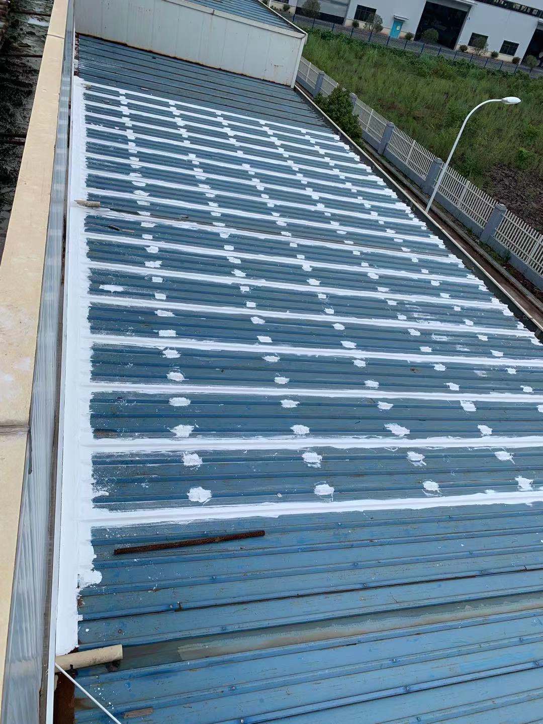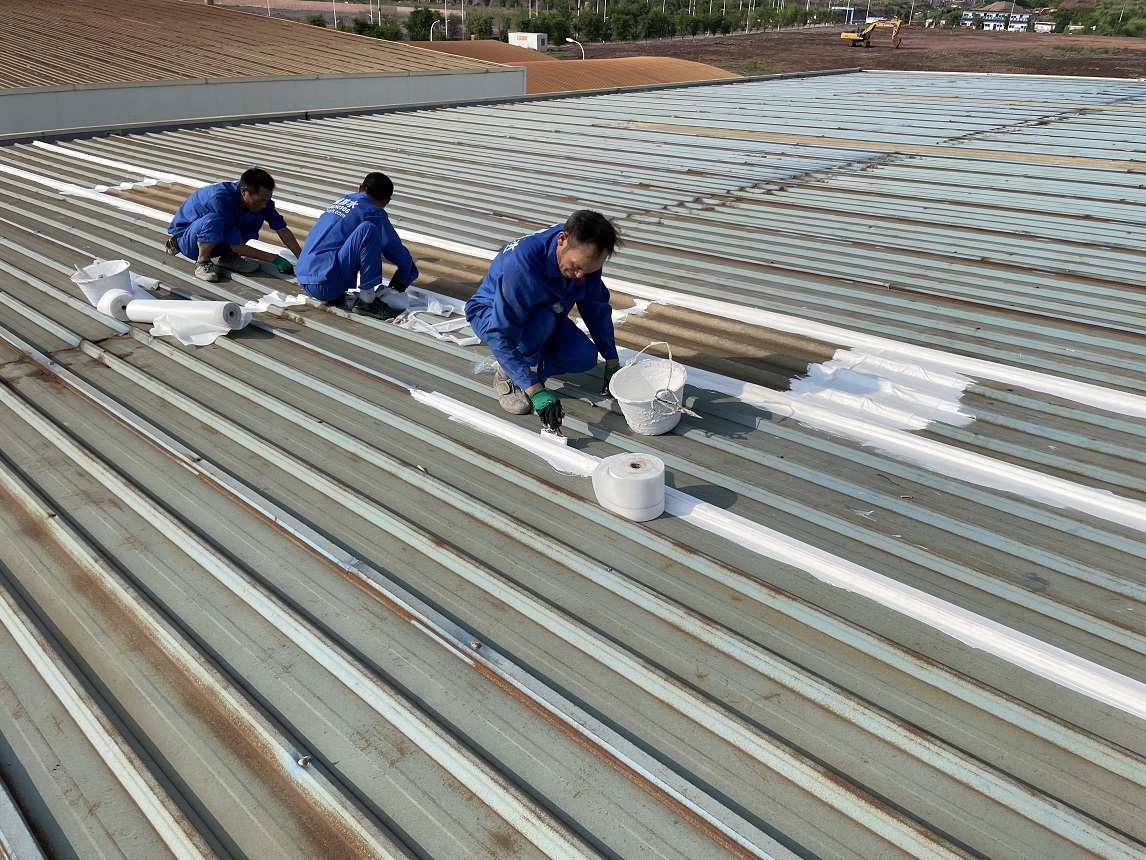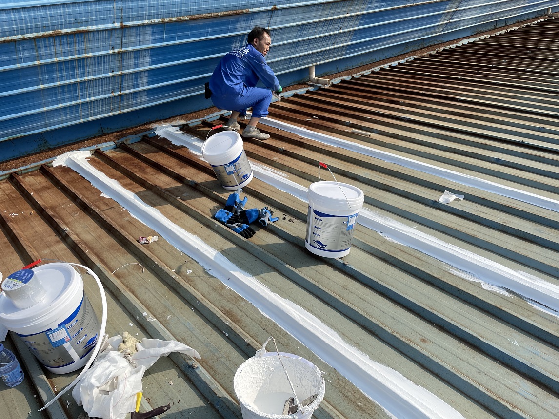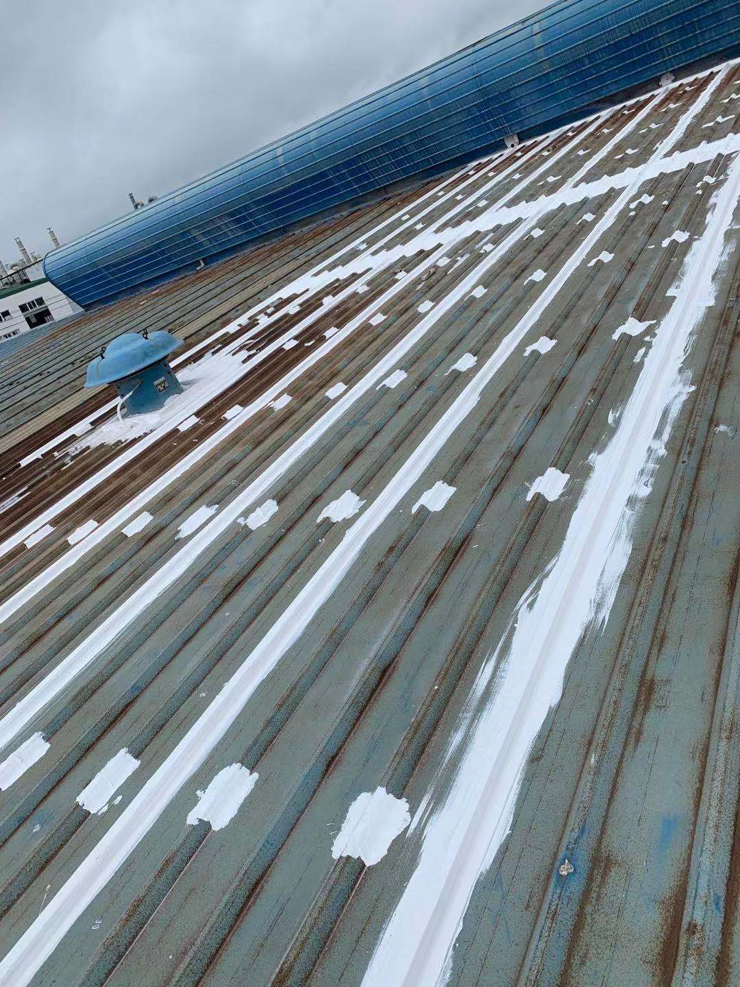 我公司采取的方案是,用SYR金屬屋面專用方式涂料配合縫織聚酯布一布三涂的方式對彩鋼頂?shù)牟输摯罱涌p以及螺絲釘進行防水密封處理