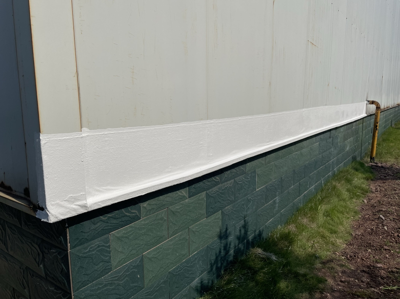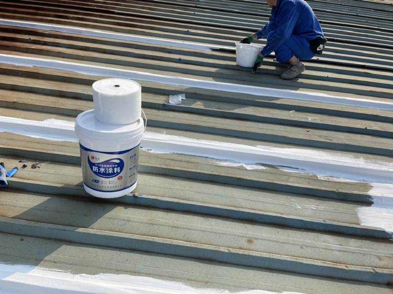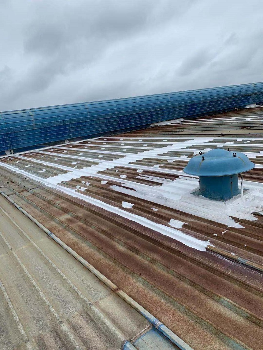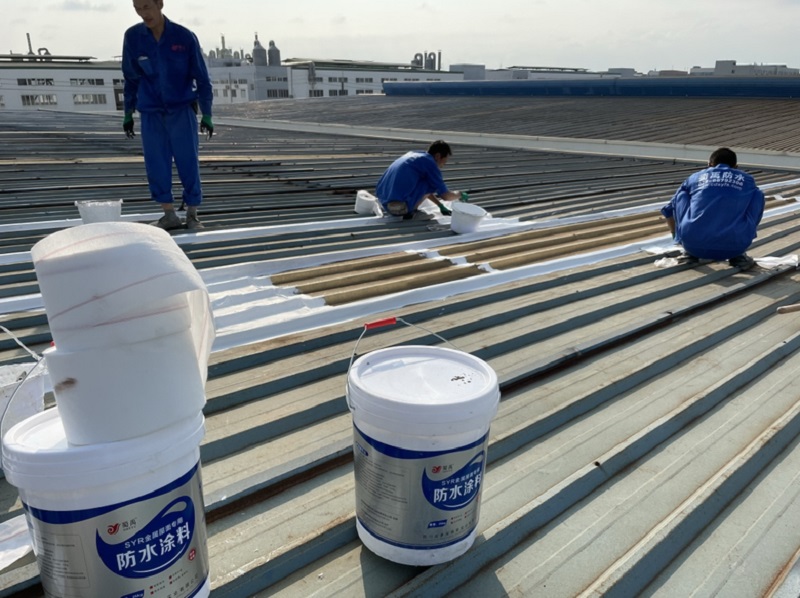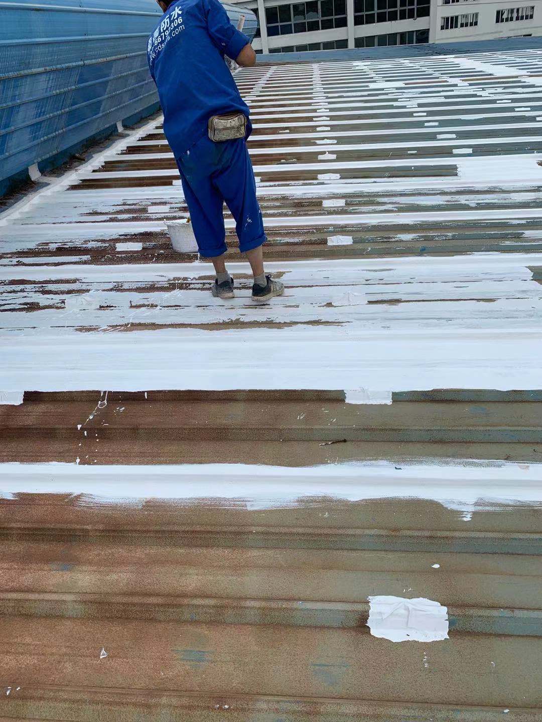 我公司采取的方案是,用SYR金屬屋面專用方式涂料配合縫織聚酯布一布三涂的方式對彩鋼頂?shù)牟输摯罱涌p以及螺絲釘進行防水密封處理