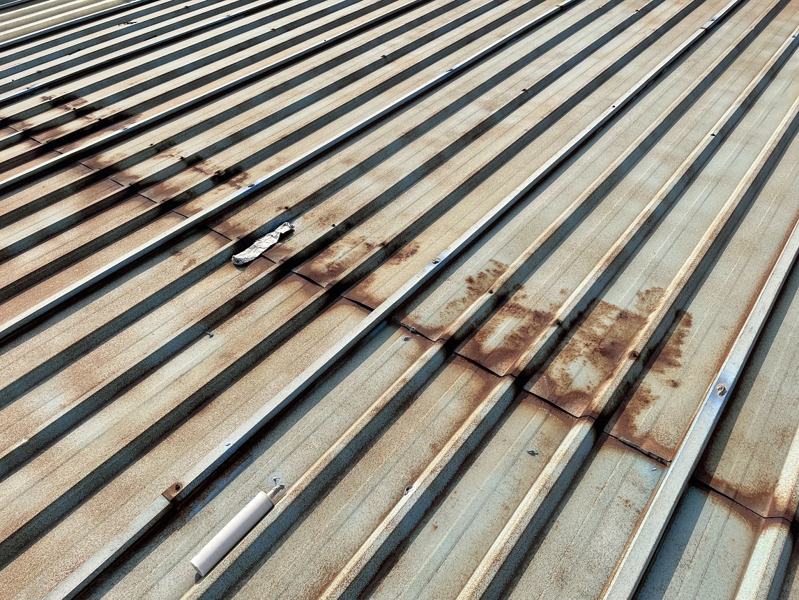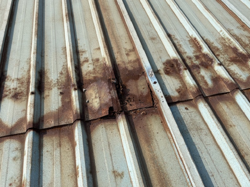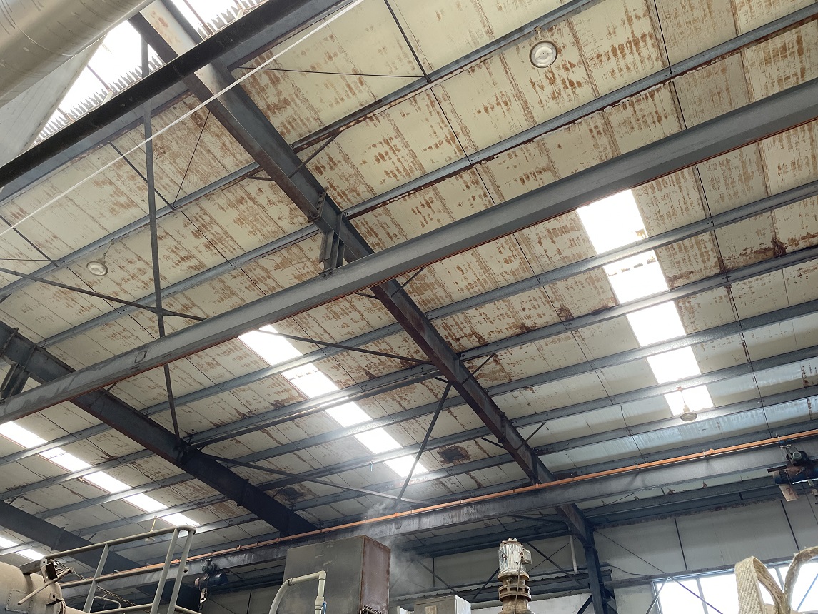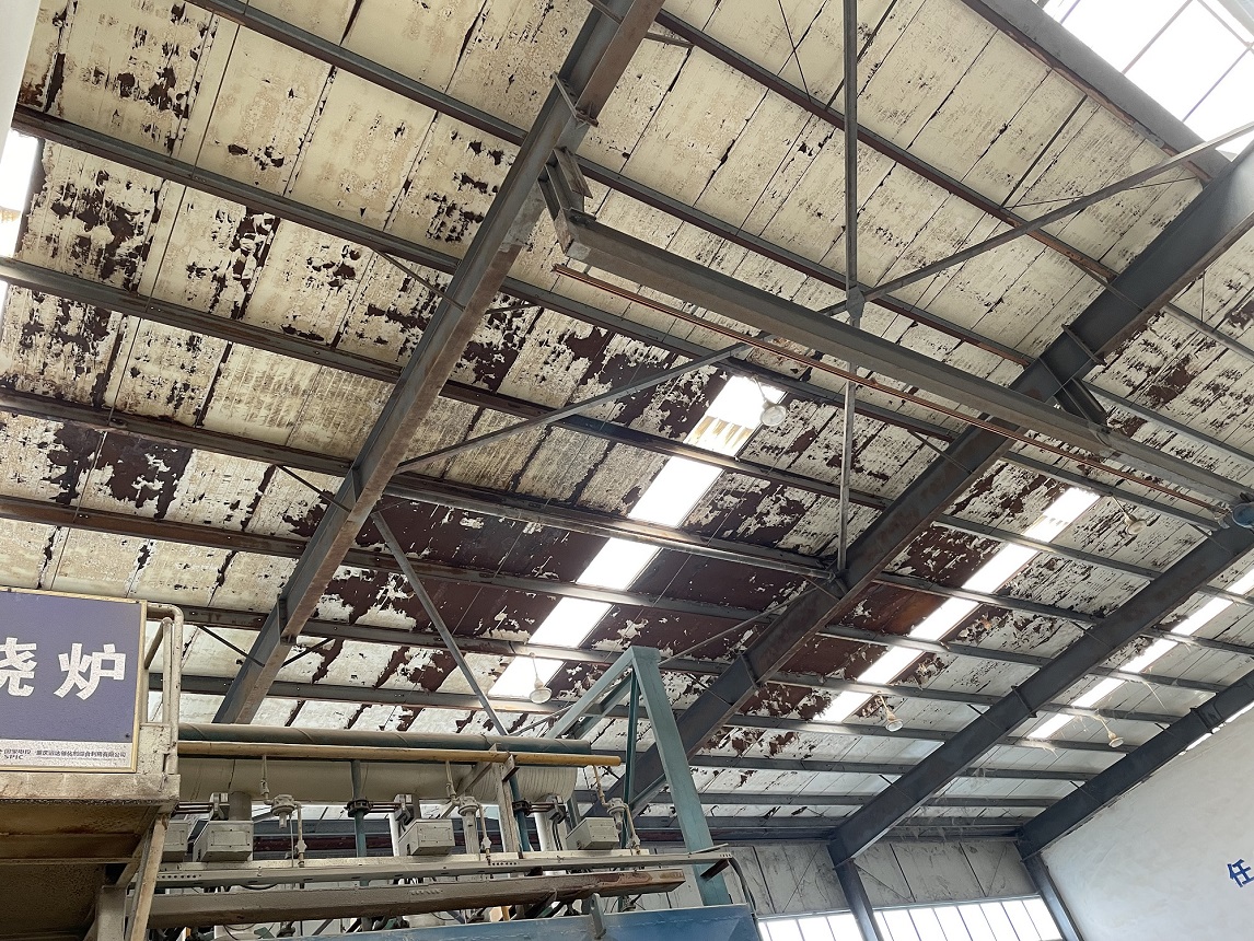 我公司2021年9月施工的位于重慶市潼南區(qū)田家工業(yè)園的重慶遠(yuǎn)達(dá)催化劑綜合利用有限公司彩鋼頂防水,此廠房內(nèi)為生產(chǎn)催化的車間,氣體具有一定的腐蝕性,導(dǎo)致廠房的彩鋼頂出現(xiàn)了一些銹蝕,彩鋼頂銹蝕情況: