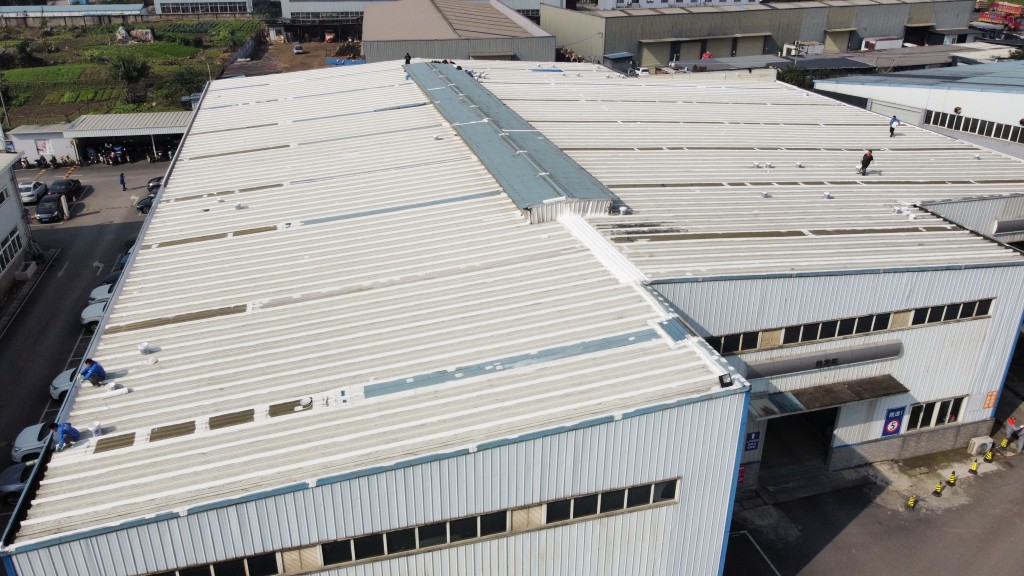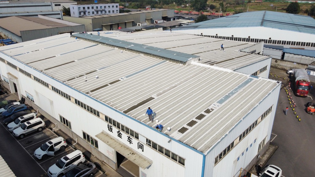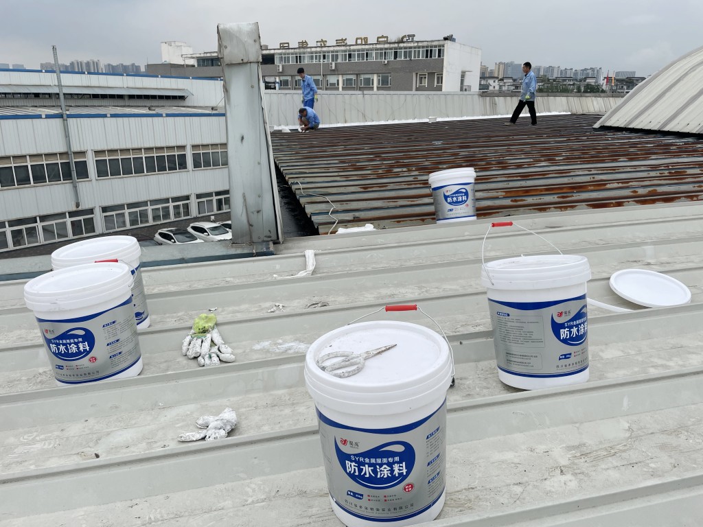 啟陽汽車華陽園區豐田鈑金車間與美容區及洗車區彩鋼頂防水工程由成都蜀禹建筑防水工程有限責任公司2021年8月進行施工,廠房為鋼結構的彩鋼頂,彩鋼頂漏水點位較多,并且豐田接車雨棚位置一塊區域彩鋼頂表面生銹了,先針對彩鋼頂進行防水處理之后此處還對彩鋼表面滿涂SYR金屬屋面防水系統進行防銹施工。此次針對此廠房頂部采用蜀禹SYR金屬屋面專用防水涂料配合專用縫織聚酯布進行施工處理,處理后經多次下雨檢驗驗收合格。