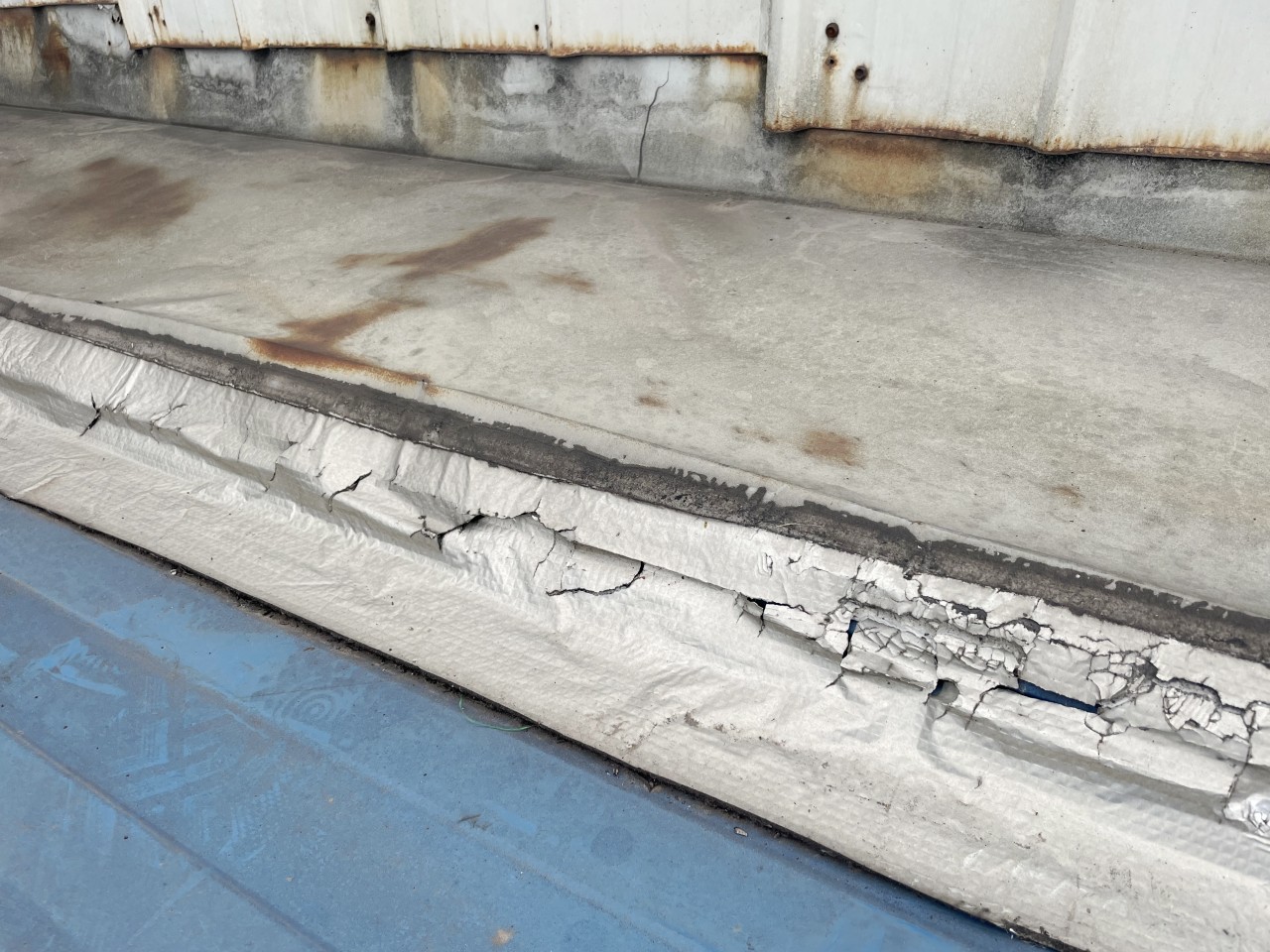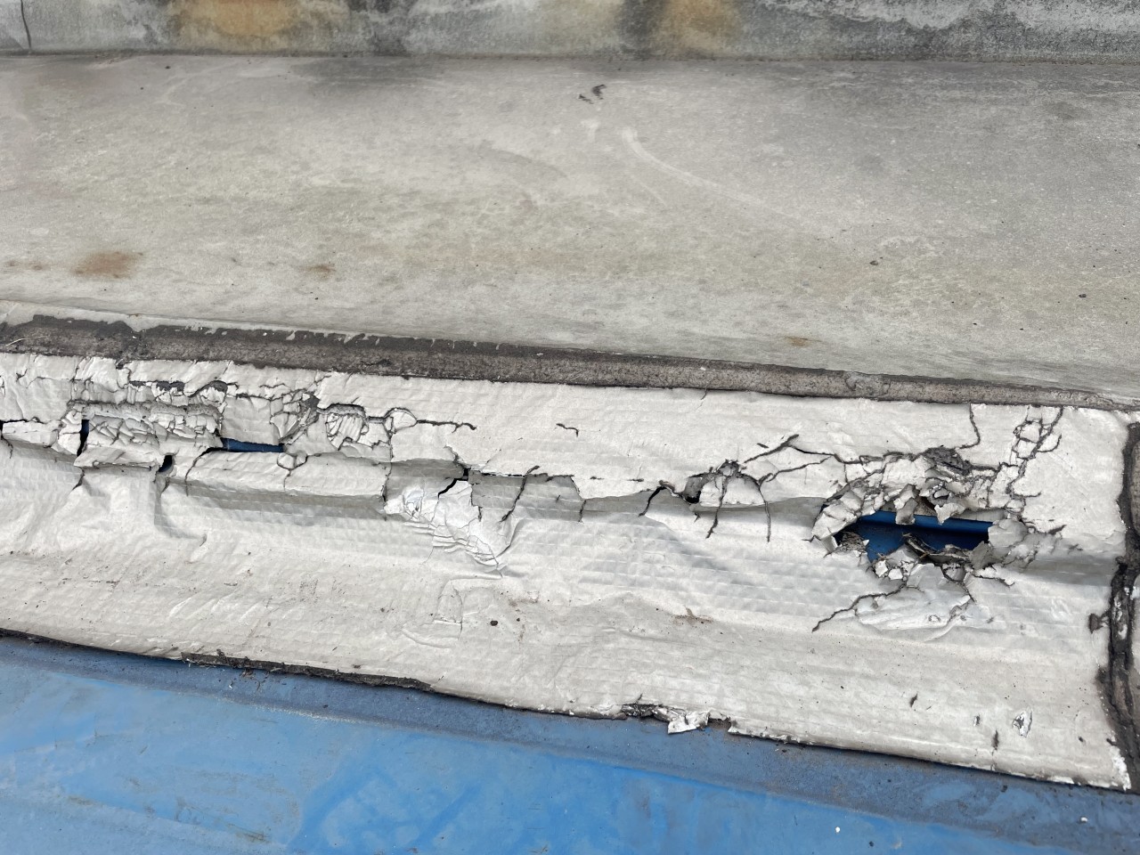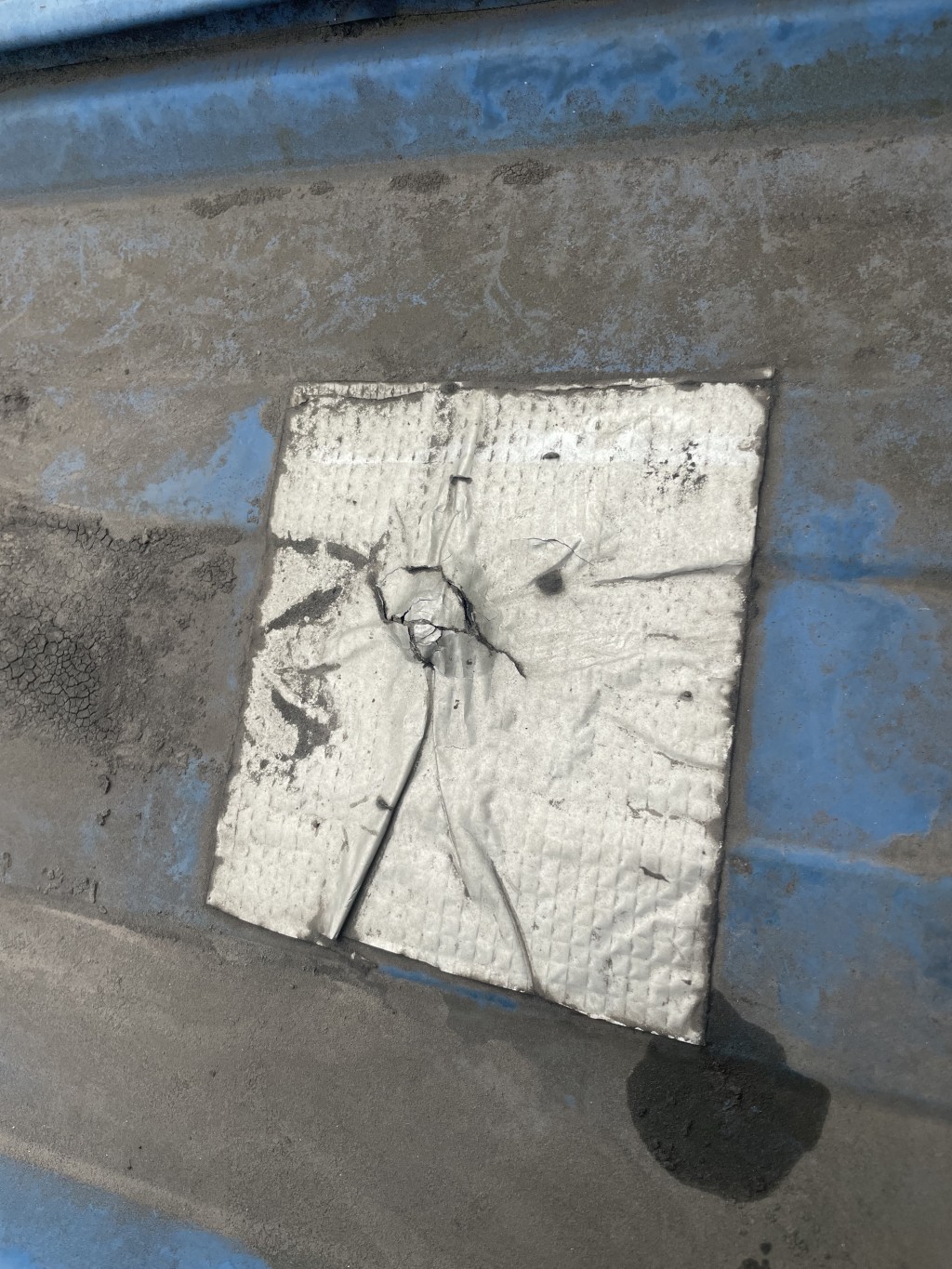 下面這照片中就是之前其他公司采用丁基膠帶修補(bǔ)的,丁基膠帶已經(jīng)開裂了,沒有起作用了。