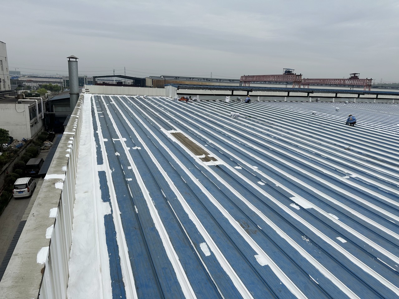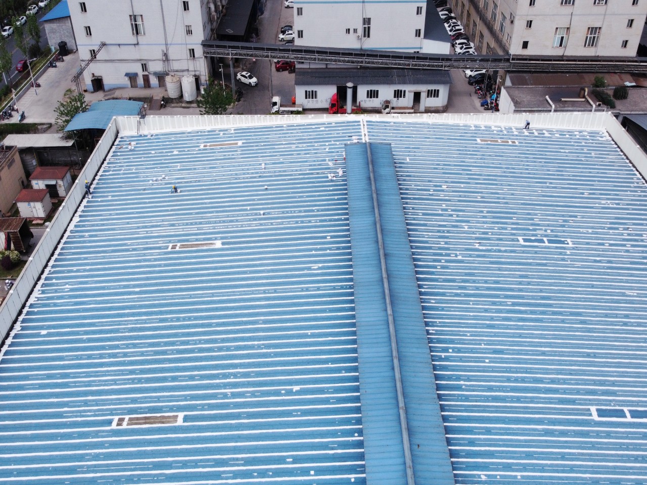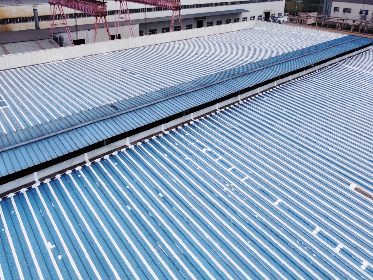 此位于重慶市榮昌區(qū)榮升路103號的鋼結(jié)構(gòu)廠房是已經(jīng)修建好了近十年了,最近一兩年逐漸出現(xiàn)了彩鋼頂漏雨的情況,開始的時候漏水點(diǎn)還不是很多,逐漸的漏水點(diǎn)越來越多,影響到了廠房內(nèi)部的生產(chǎn)活動,業(yè)主方開始也找其他公司進(jìn)行過一些修補(bǔ)施工,但是效果不是很理想,之前的施工方采用的是丁基膠帶進(jìn)行粘貼密封修補(bǔ)的,但是沒有過多久,那丁基膠帶就開裂了,又漏雨了,客戶找到我們公司,我們公司根據(jù)現(xiàn)場查勘之后,定制了適合現(xiàn)場實(shí)際的施工方案,采用SYR金屬屋面防水涂料配合縫織聚酯布針對彩鋼頂?shù)牟输摯罱涌p、中間固定螺釘、彩鋼板的一些破損孔洞部位進(jìn)行一布三涂的方式進(jìn)行防水補(bǔ)漏施工,客戶看了施工方案之后比較滿意,然后又考察了采用SYR金屬屋面防水涂料施工的其他地方的工地之后,最終確定由我公司對此彩鋼頂進(jìn)行全面的防水補(bǔ)漏處理。