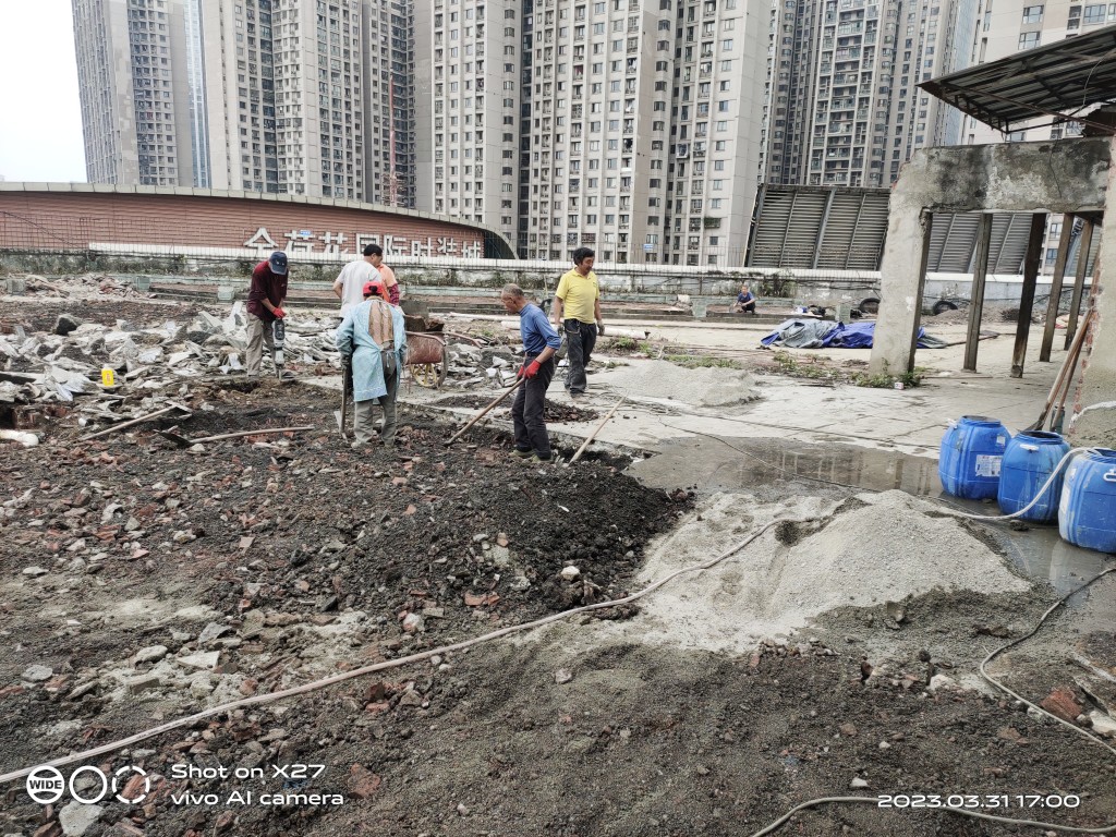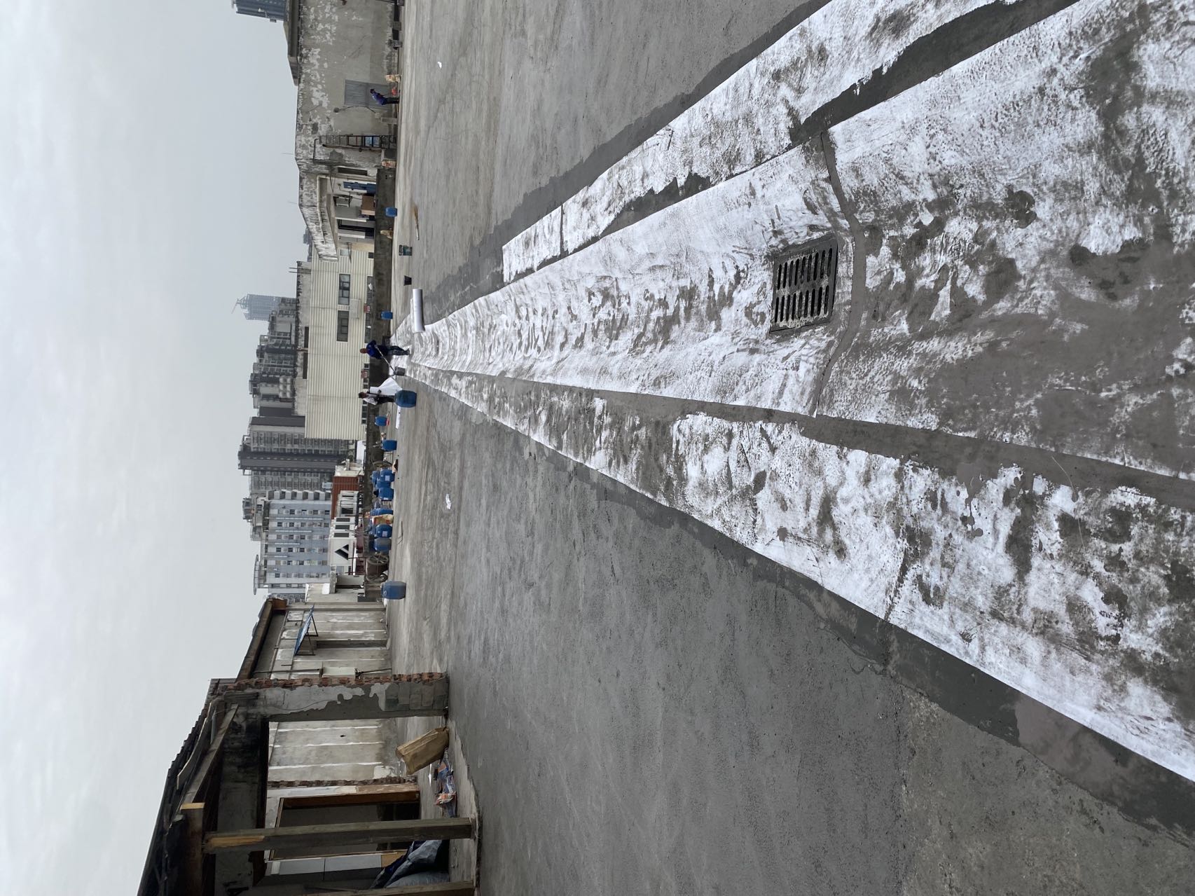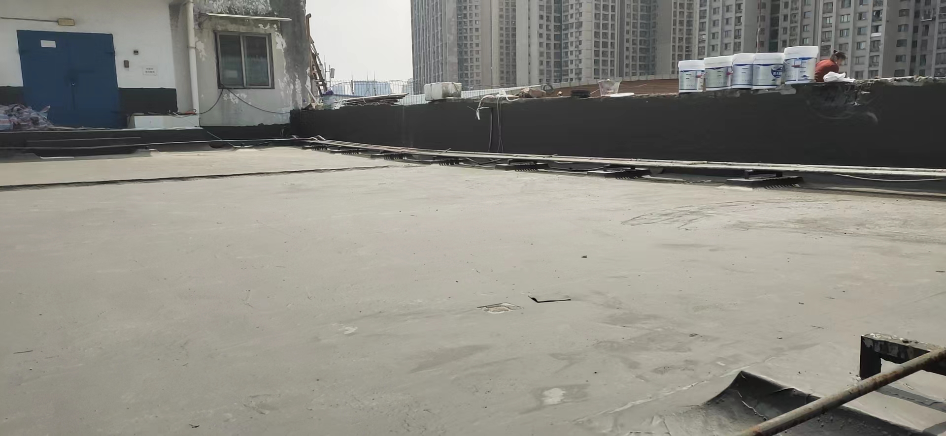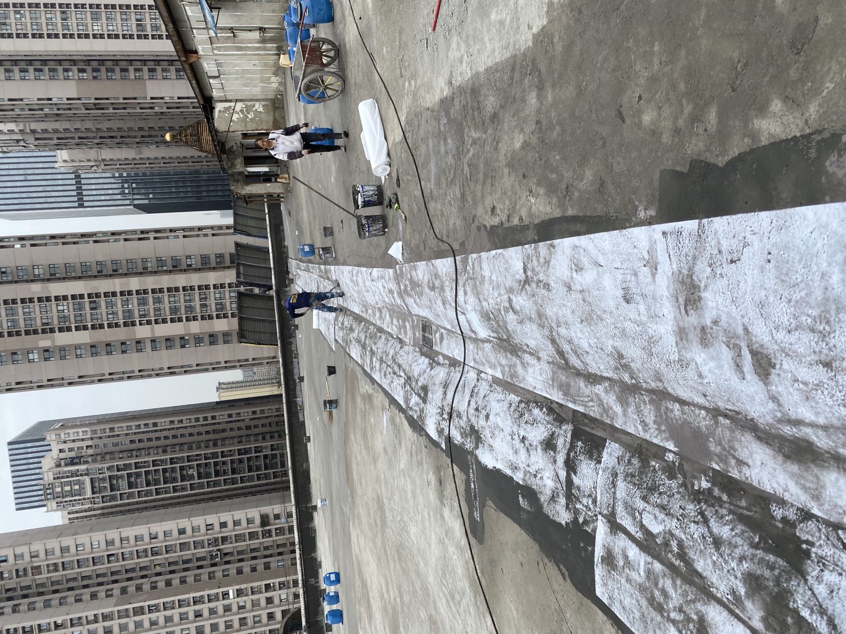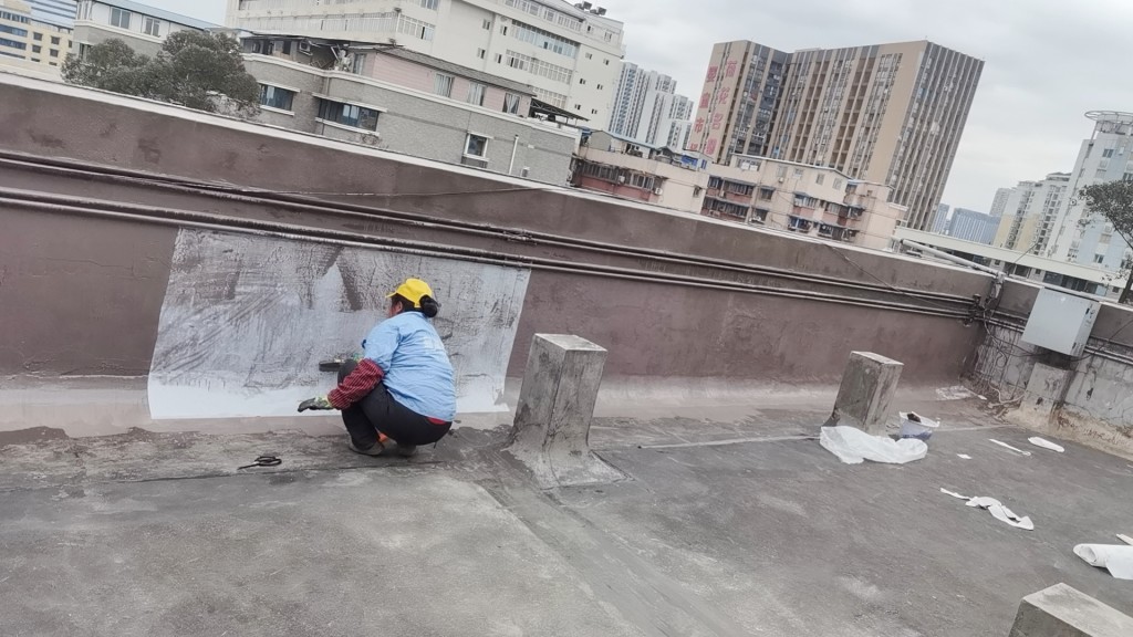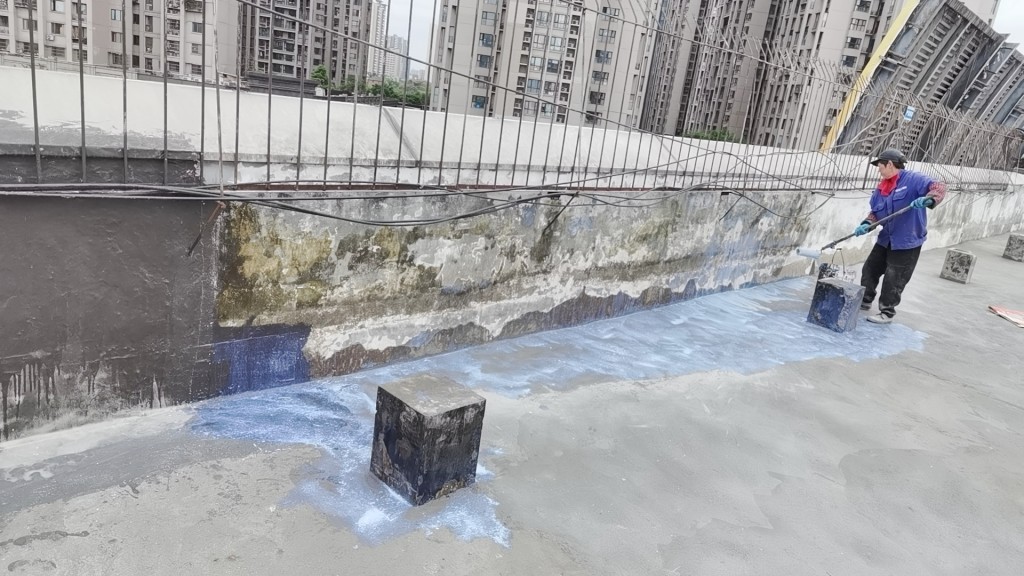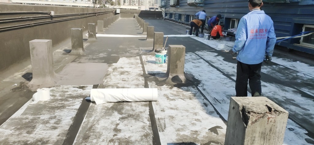 這個工程具有相當(dāng)大的施工難度,主要是因為屋頂修建了很多花臺,并貼了瓷磚,導(dǎo)致屋頂非常雜亂。為了確保工程的順利進(jìn)行,在施工前,我們首先將屋頂?shù)幕ㄅ_拆除,地面的瓷磚以及剛性保護(hù)層拆除,并將建渣搬運下樓清運出場。待地面平整好后,我們在基層表面滾涂混凝土液體硬化劑,對基面進(jìn)行固化處理。