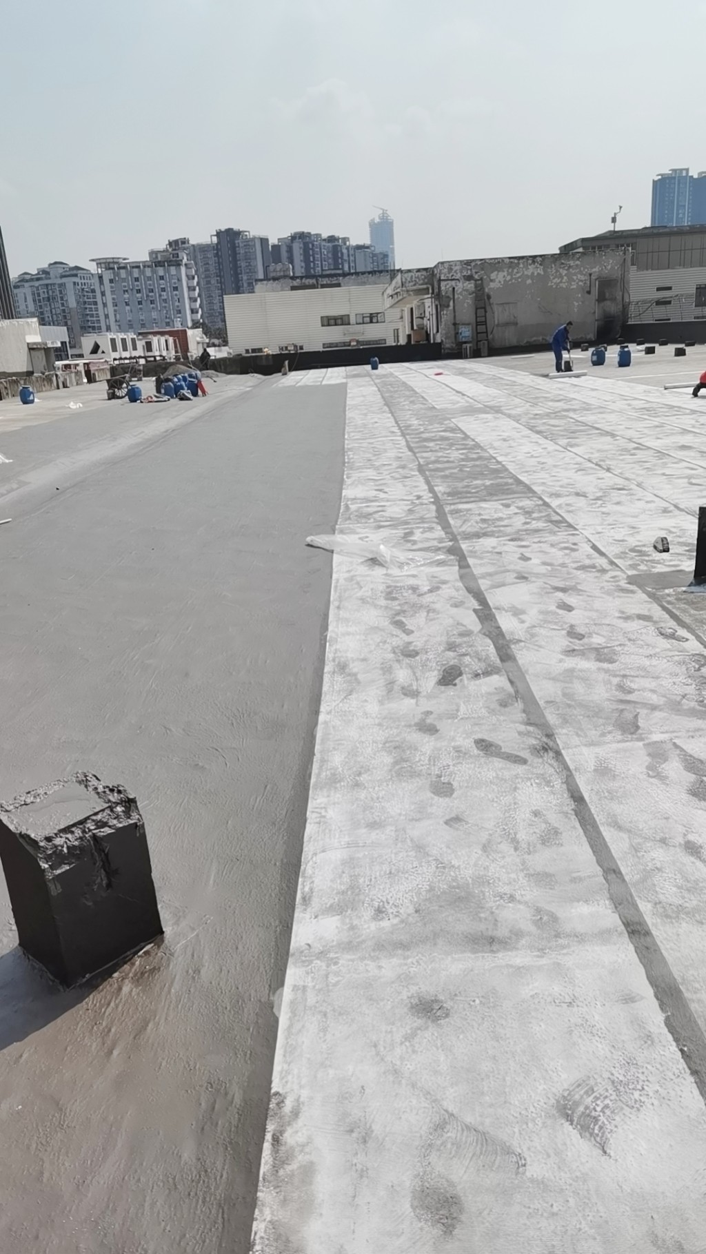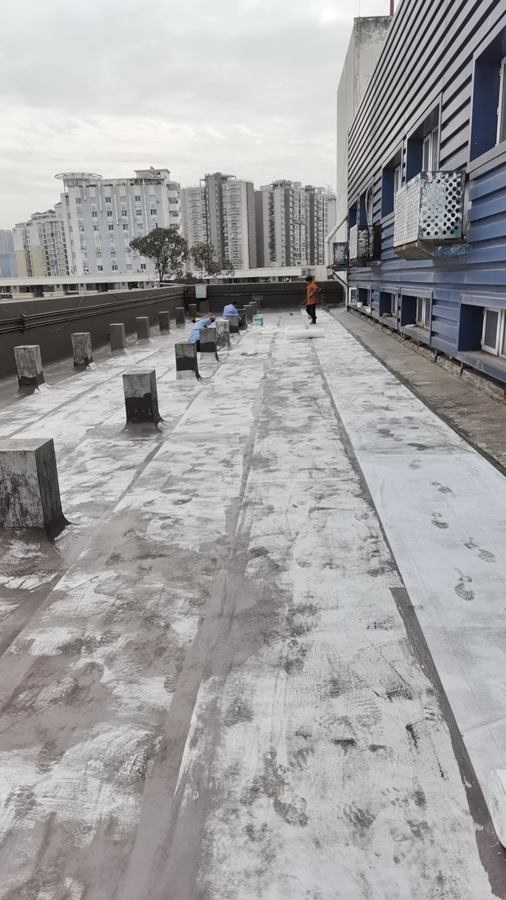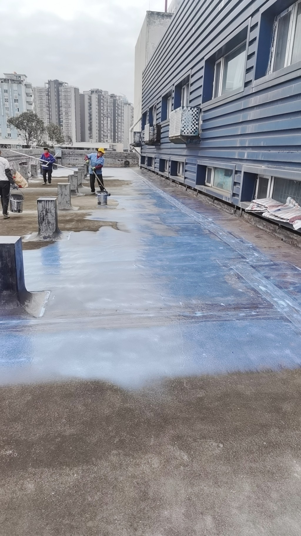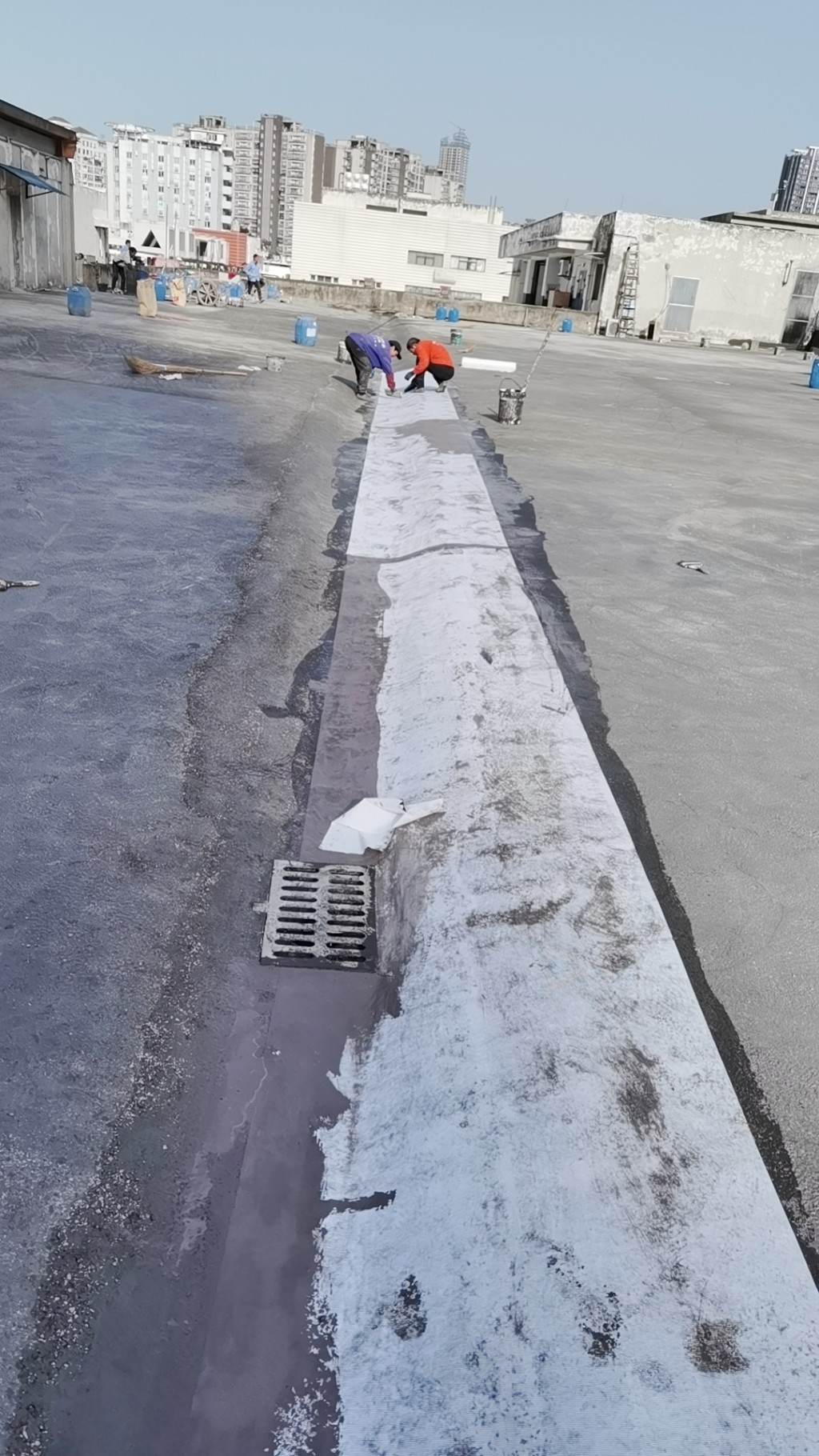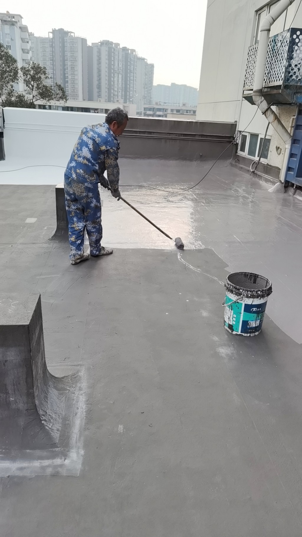 這個工程具有相當(dāng)大的施工難度,主要是因為屋頂修建了很多花臺,并貼了瓷磚,導(dǎo)致屋頂非常雜亂。為了確保工程的順利進(jìn)行,在施工前,我們首先將屋頂?shù)幕ㄅ_拆除,地面的瓷磚以及剛性保護(hù)層拆除,并將建渣搬運下樓清運出場。待地面平整好后,我們在基層表面滾涂混凝土液體硬化劑,對基面進(jìn)行固化處理。