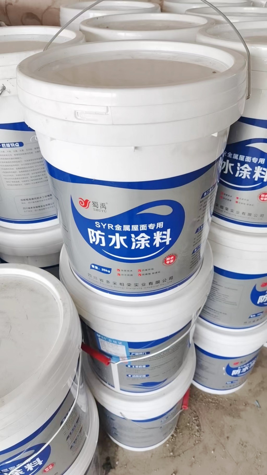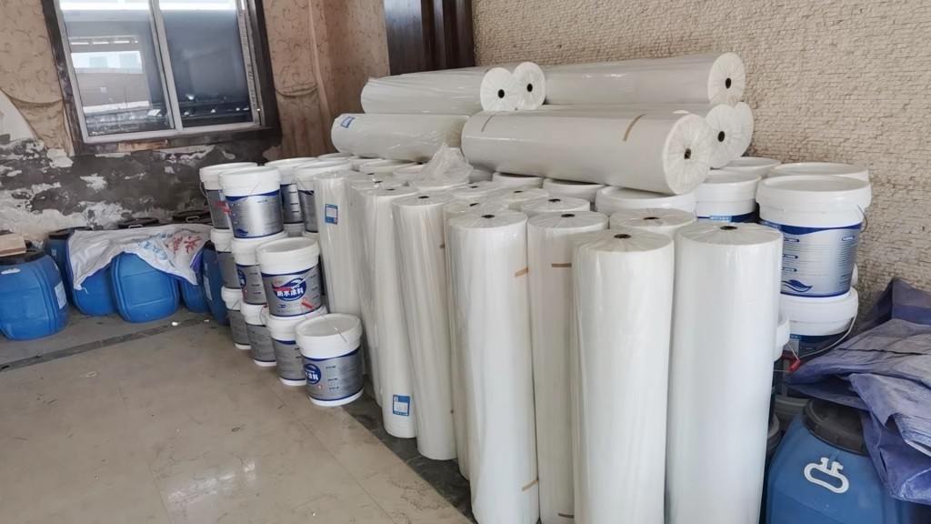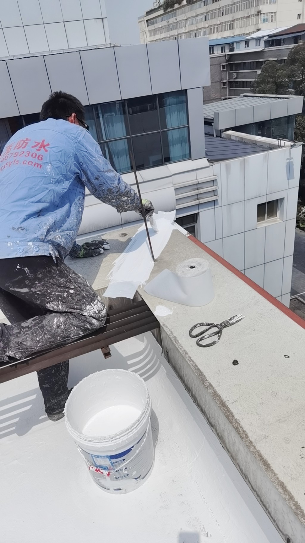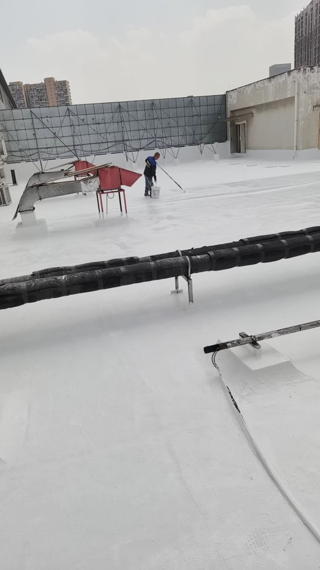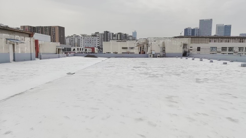 隨后,我們在屋頂表面涂刷蜀禹Ⅰ型聚合物防水涂料,并滿鋪貼專用聚酯布,然后再涂刷Ⅰ型聚合物防水涂料。待涂料干后,我們在表面涂刷兩遍SYR金屬屋面專用防水涂料。