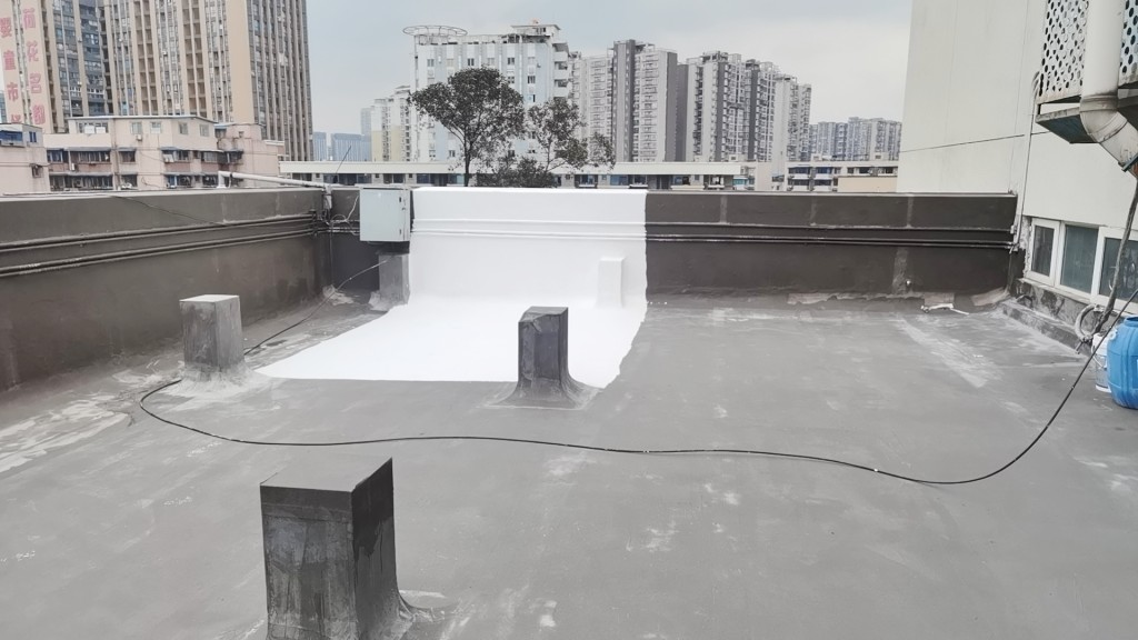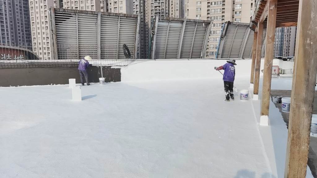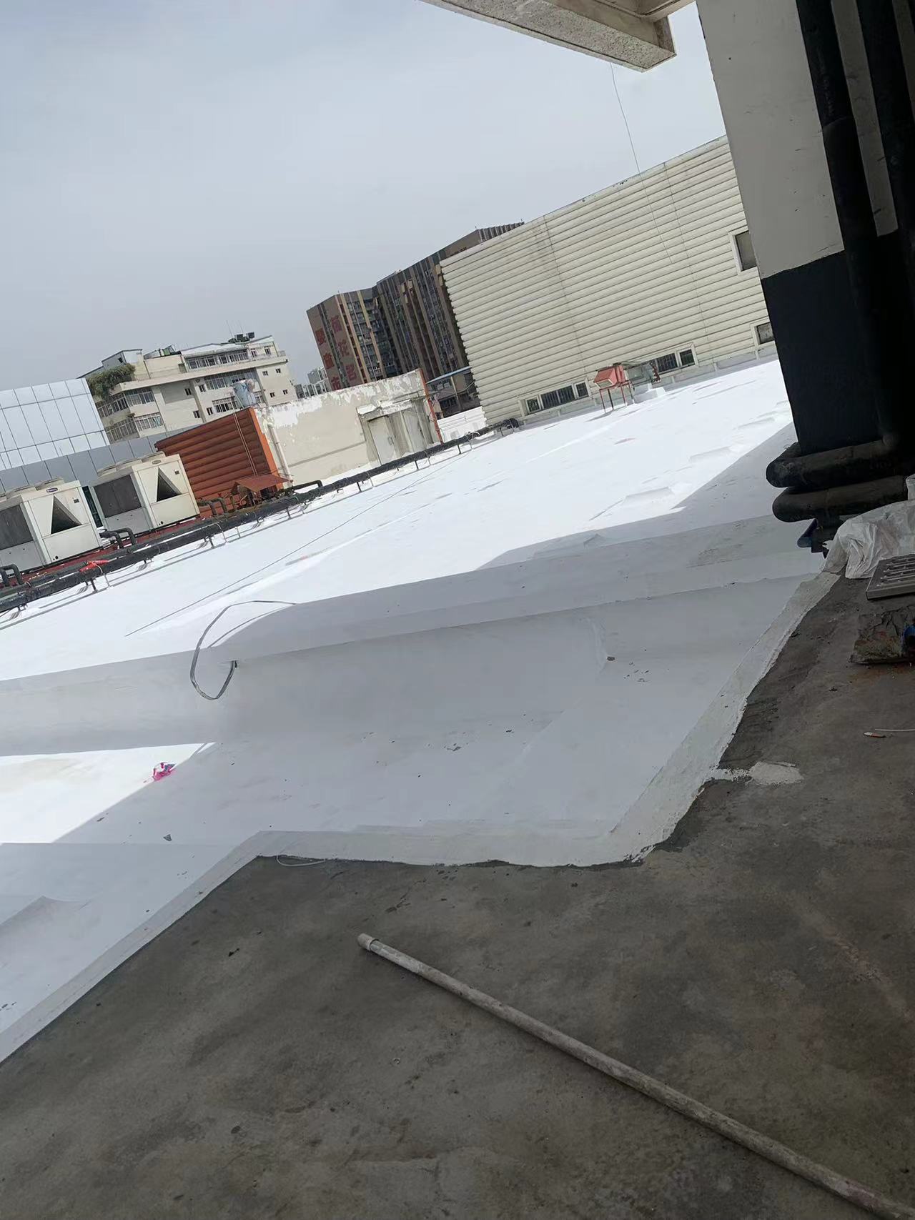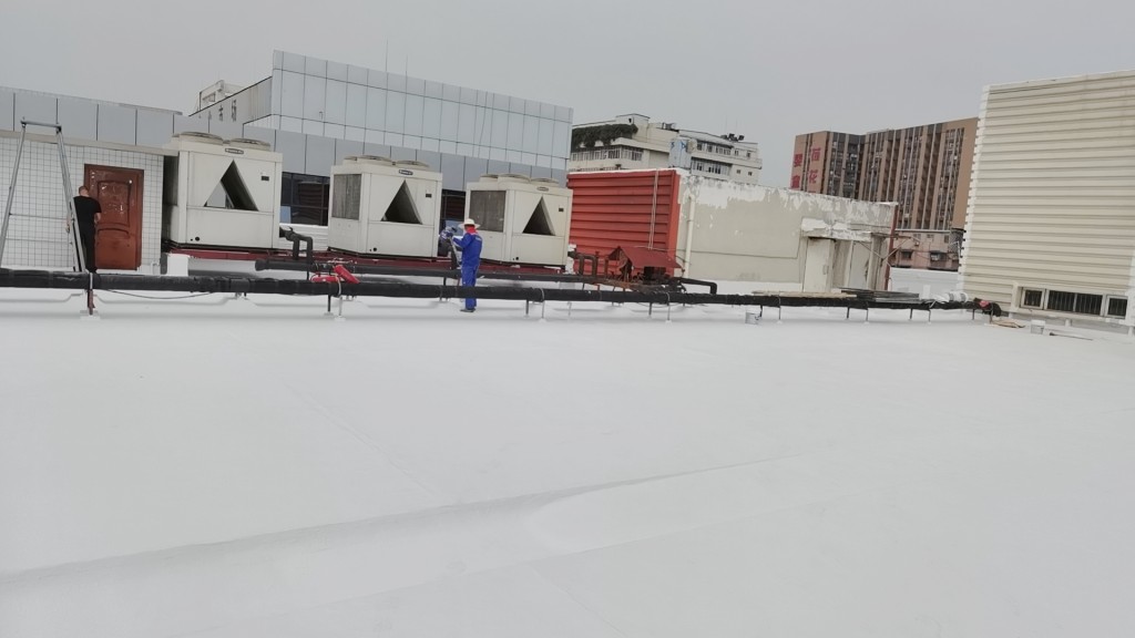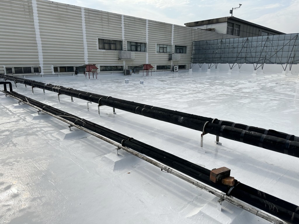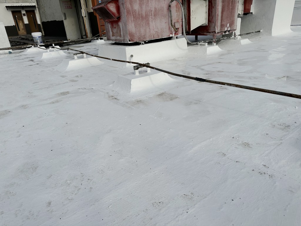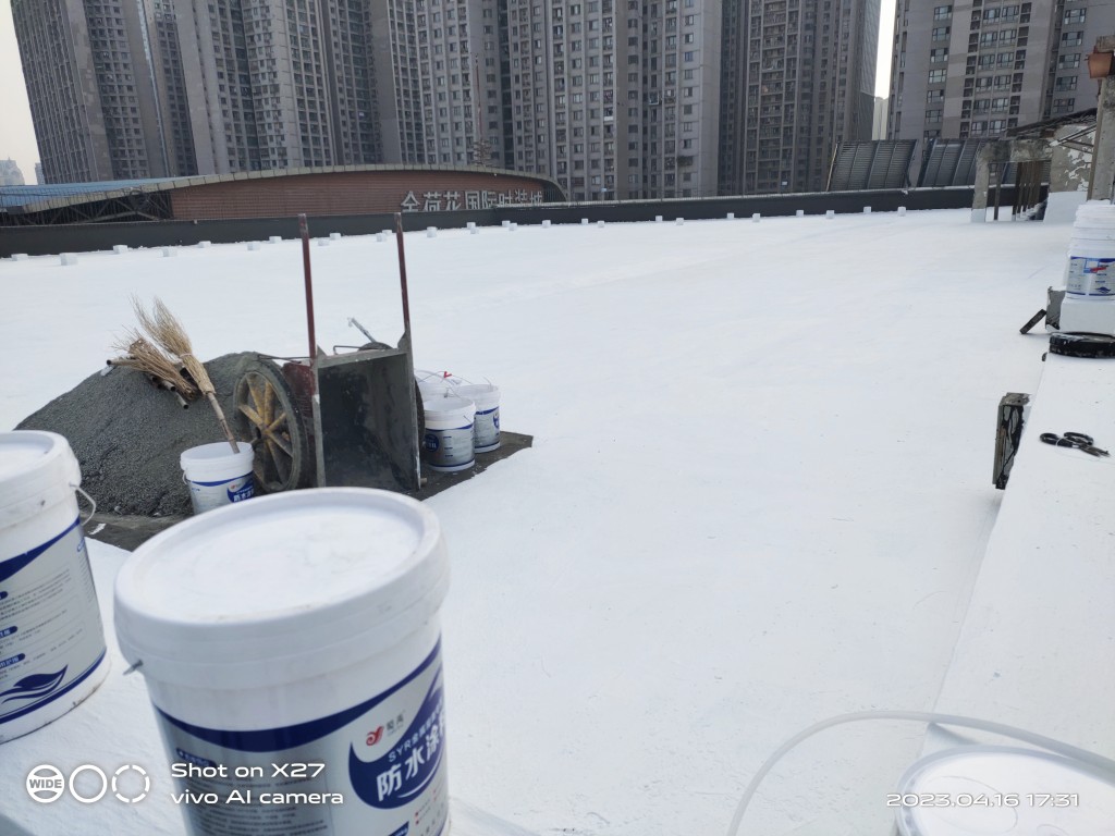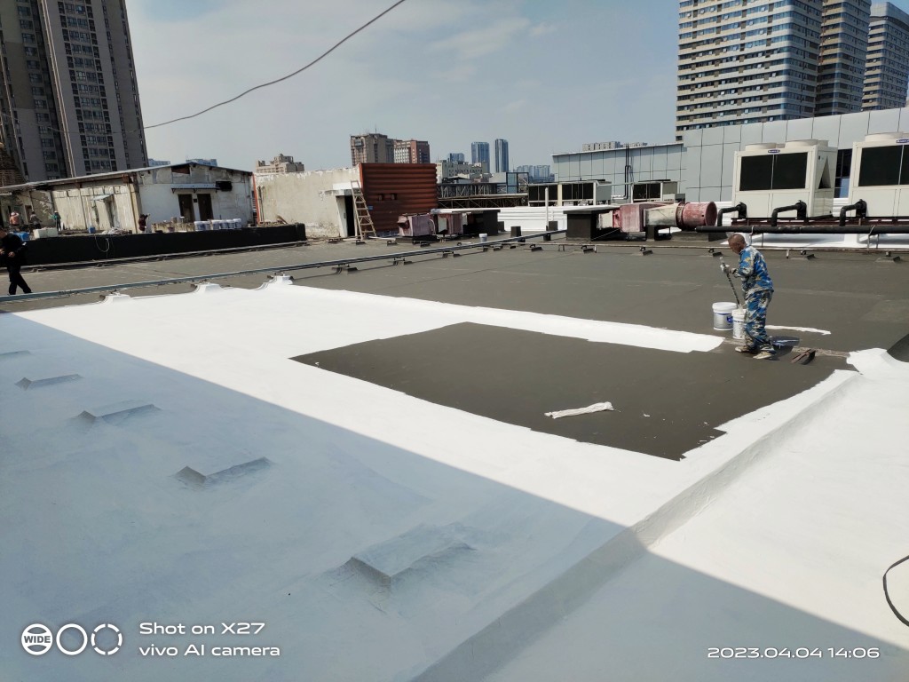 屋頂表面采用聚合物防水涂料、SYR金屬屋面防水涂料、聚酯布進(jìn)行防水施工