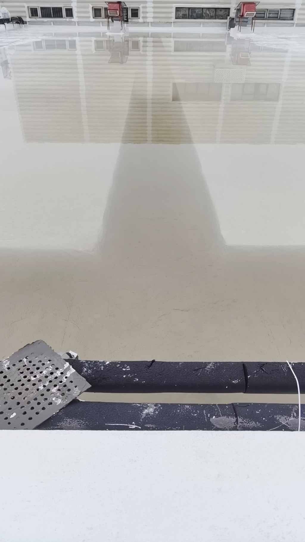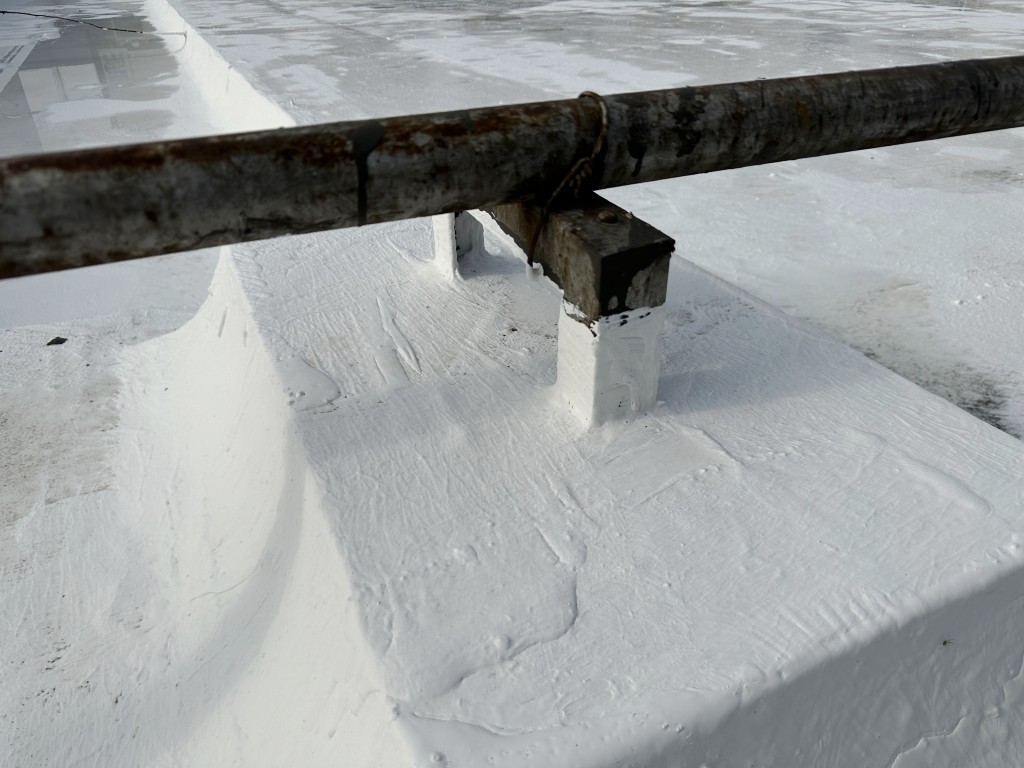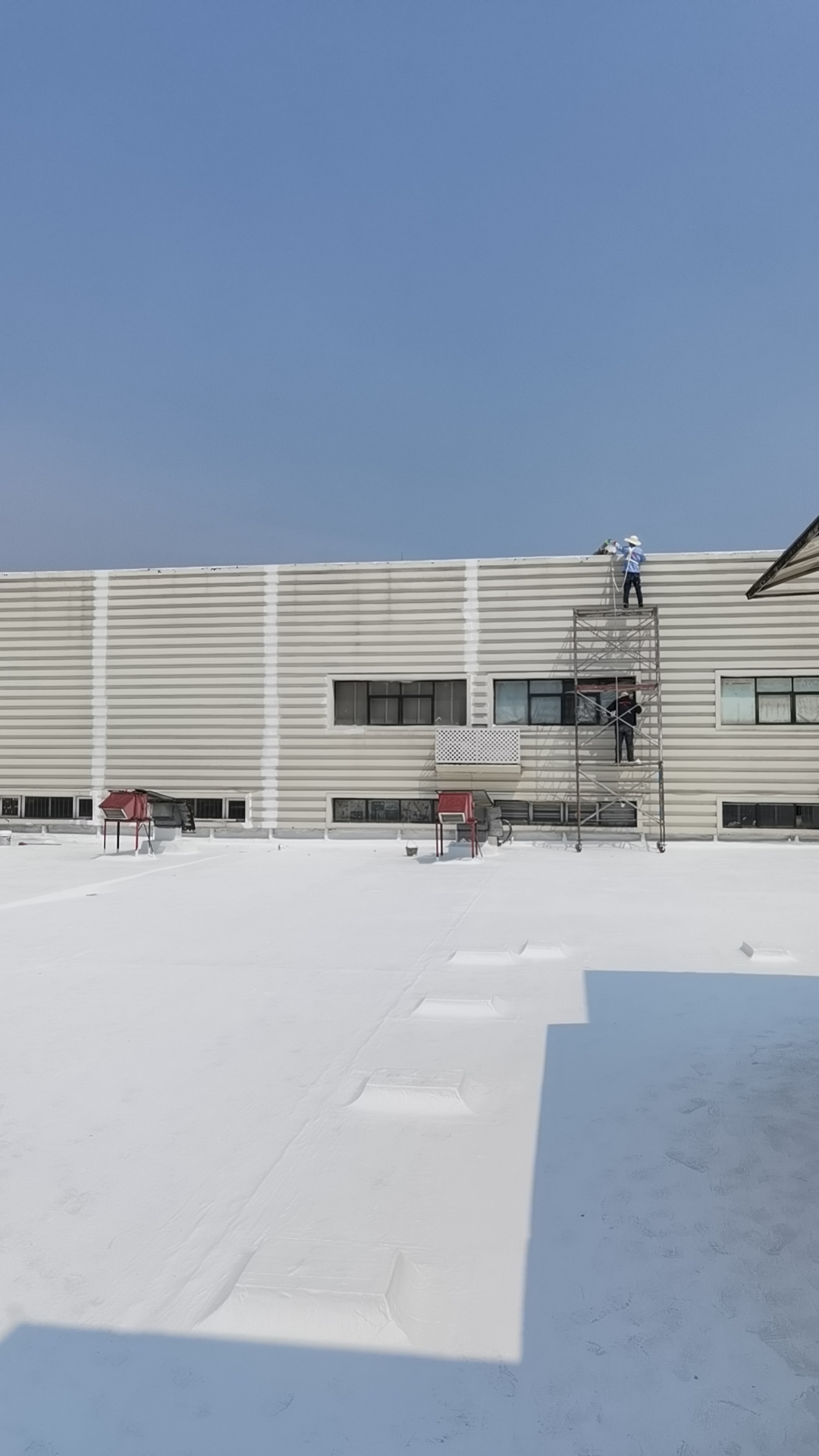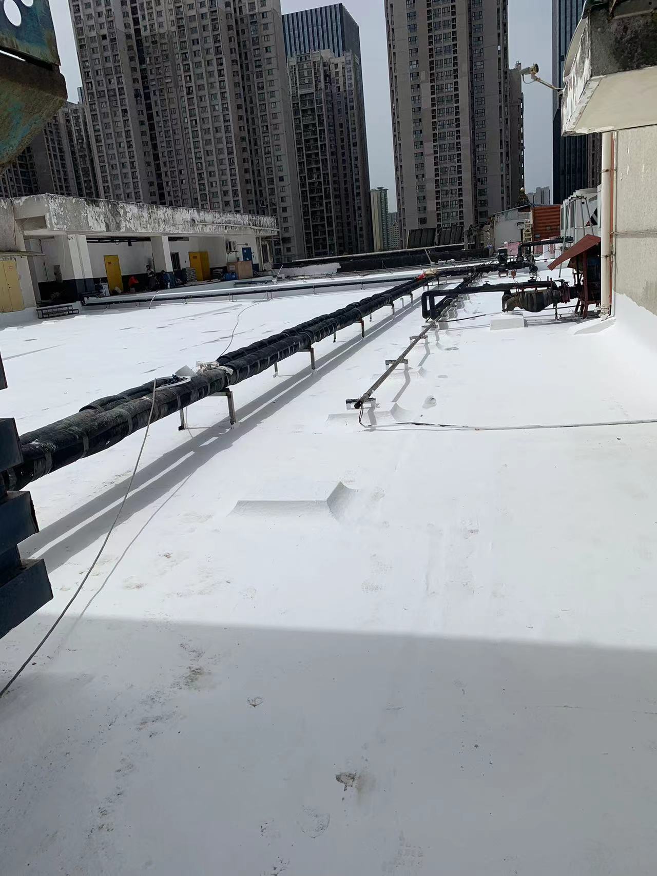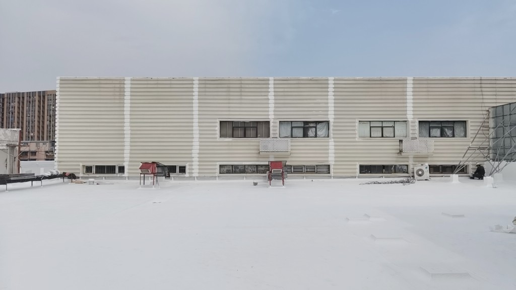 此外,還在保溫層內(nèi)增加了一些排氣管,以確保屋頂保溫層內(nèi)的氣壓與外界平衡,避免在夏季時屋頂表面出現(xiàn)鼓包。對于屋頂?shù)姆指艨p部位,我們采用聚合物防水涂料配合15cm寬聚酯布進(jìn)行一布三涂的方式重點加強處理。