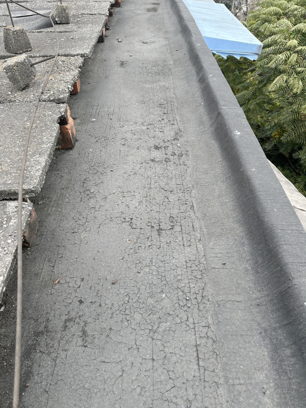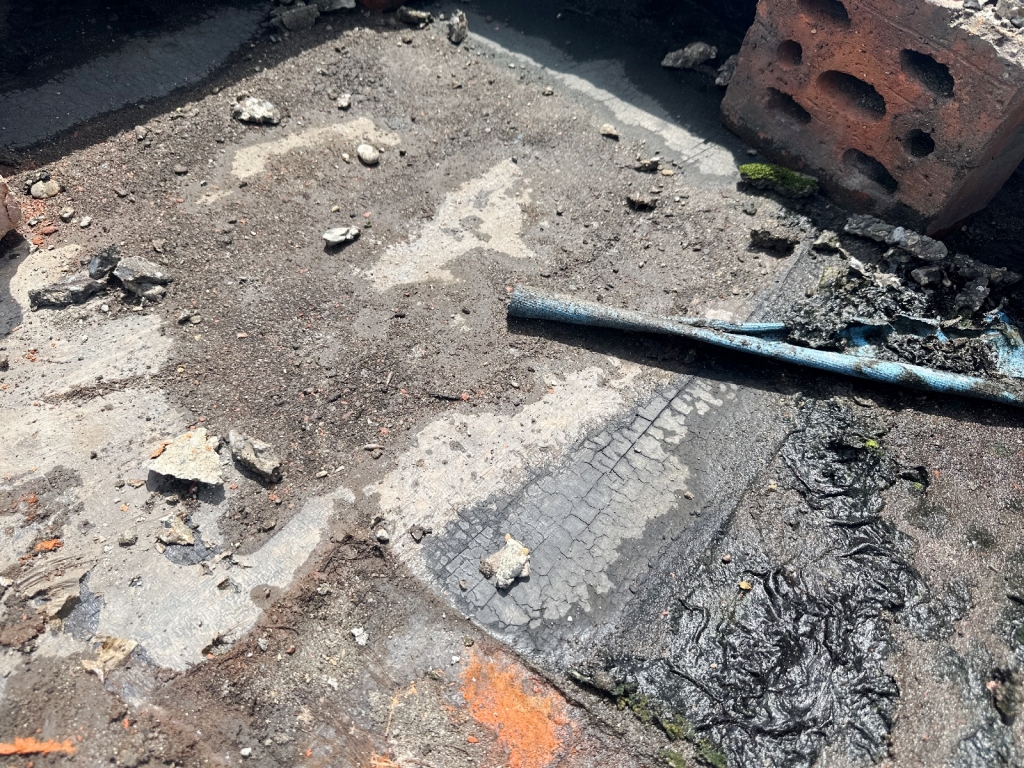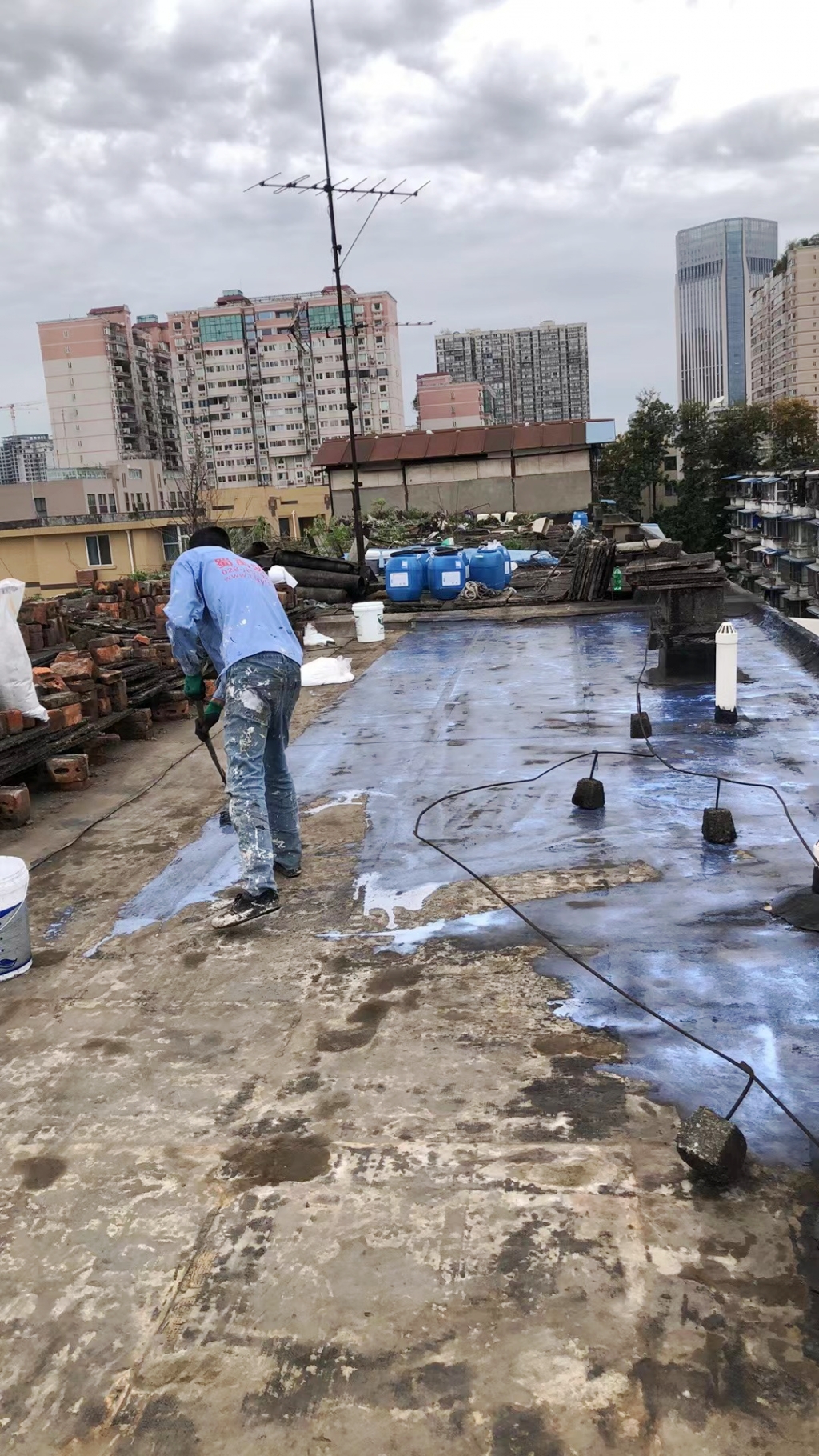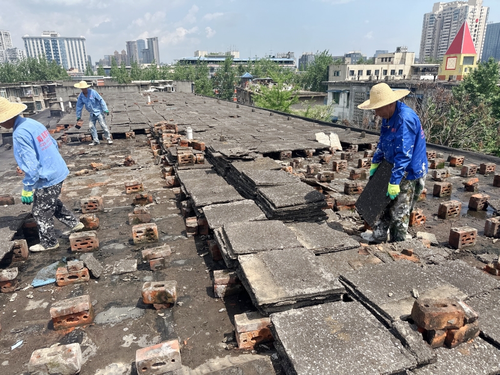 項(xiàng)目初期,蜀禹防水團(tuán)隊(duì)首先對(duì)屋頂進(jìn)行了全面的勘查與評(píng)估,隨后,施工隊(duì)伍小心翼翼地將屋頂表面的隔熱板逐一揭開,并將下方的磚塊逐一搬開,確保施工區(qū)域完全暴露且基層干凈無雜物。這一步驟雖然繁瑣,但為后續(xù)的防水處理奠定了堅(jiān)實(shí)的基礎(chǔ)。