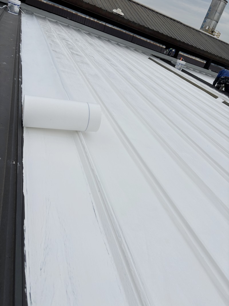 第二遍防水涂料涂刷:縫織聚酯布鋪貼完成后,在其表面滿涂刷第二遍 SYR 金屬屋面專用防水涂料,使防水涂料充分滲透聚酯布纖維,進(jìn)一步加強防水涂層的整體性;