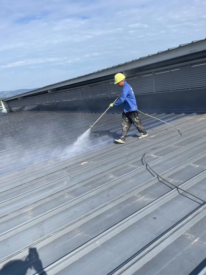 基面預處理:先對 3 號廠房彩鋼頂表面進行全面清掃,清除灰塵、雜物及松動銹蝕層,確保基面干凈平整;隨后滿噴涂一遍納米固銹劑,通過納米滲透技術固化基面銹蝕,防止銹跡擴散,為后續防水涂層建立穩固基礎。
