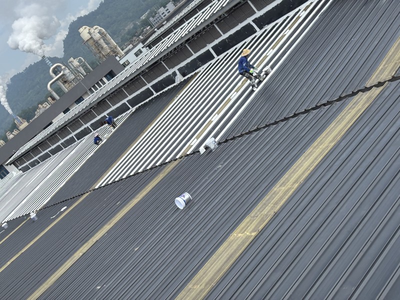 整體防腐翻新:完成關鍵部位處理后,對整個彩鋼頂屋面滿噴涂第一遍 SYR 金屬屋面專用防水涂料,實現全面防腐;待涂層干透后,再噴涂第二遍防水涂料,進一步提升屋面的抗老化、抗風雨侵蝕能力。