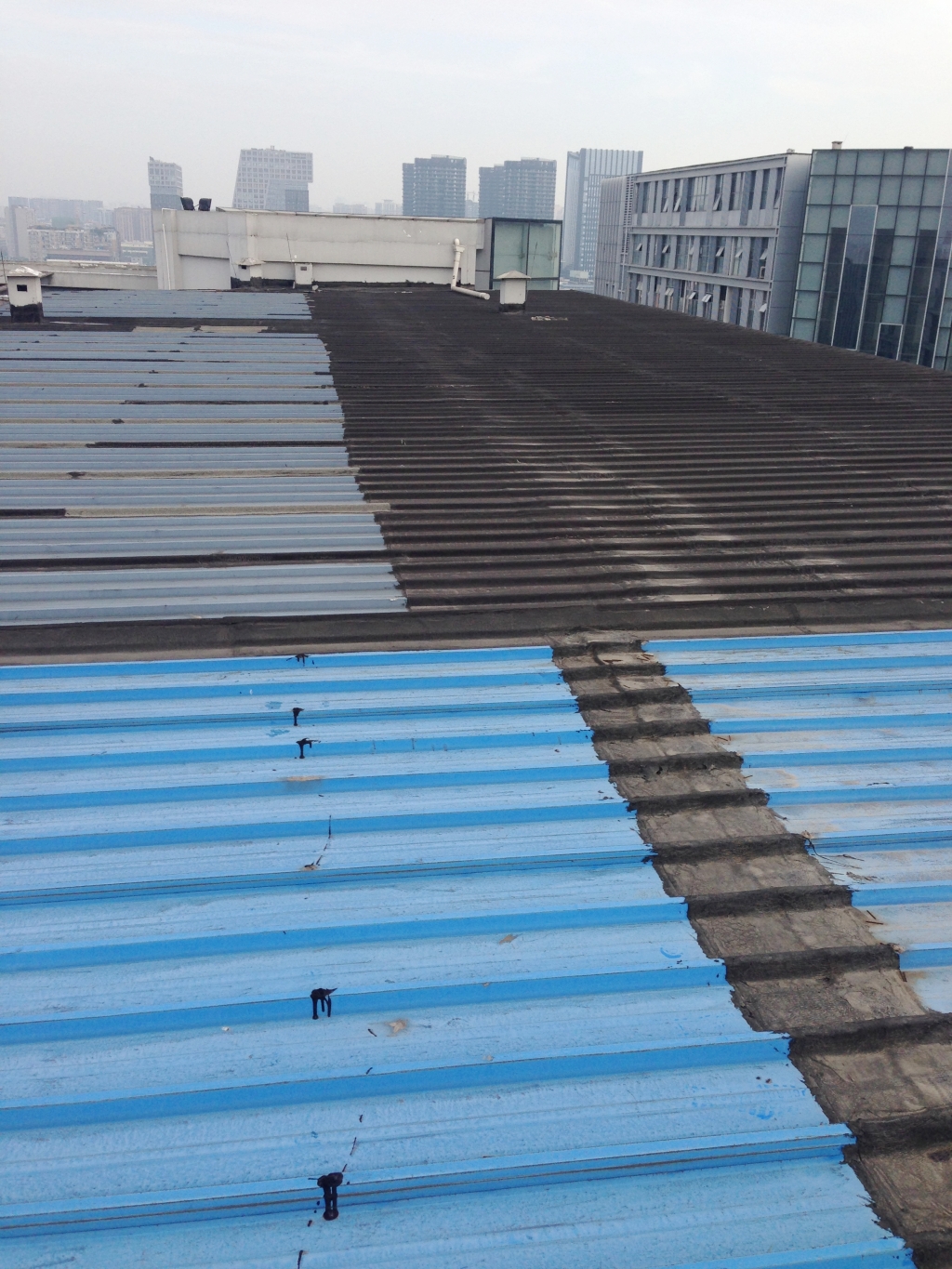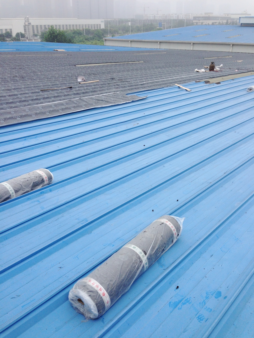 根據以前多處工地情況,使用改性瀝青防水卷材局部粘貼彩鋼瓦連接縫,由于彩鋼瓦表面熱脹冷縮伸縮性較大,改性瀝青防水卷材多數會被拉裂,而且改性瀝青卷材粘貼太窄,邊沿也會有部份翹邊。所以我們現在對于彩鋼瓦漏水情況采取的方案是:將漏水的位置對應一直到脊梁的彩鋼瓦表面全部滿鋪一層改性瀝青防水卷材,由于表面均為改性瀝青防水卷材,底下彩鋼瓦張合均不影響表面防水卷材。
