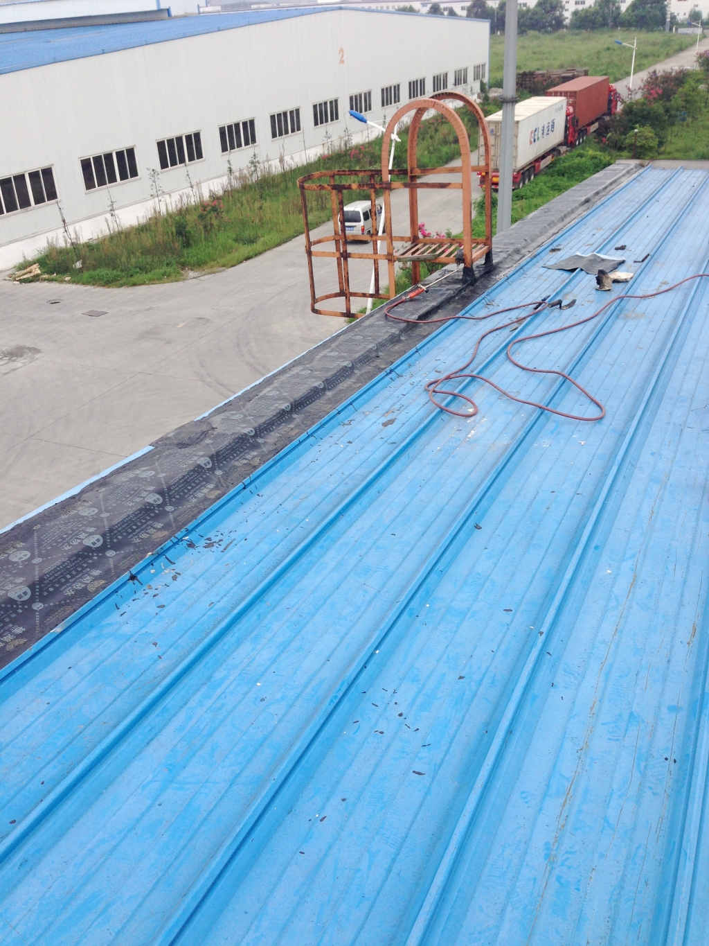 彩鋼瓦屋頂經過幾年的風吹雨打,表面油漆容易掉落,油漆掉落后表面很快就會出現銹跡斑斑,個別地方彩鋼瓦就會銹穿孔,導致漏水,滿鋪一層改性瀝青防水卷材,不但能夠起到防水作用,而且保護了彩鋼瓦,使彩鋼瓦的使用壽命延長,所以此工程我們采用漏水區域頂全全做一層SBS改性瀝青防水卷材的方法。